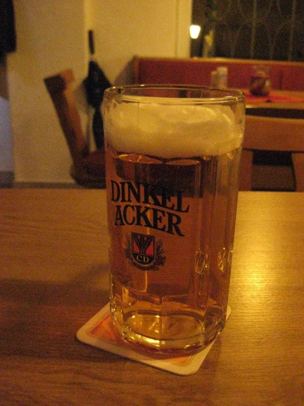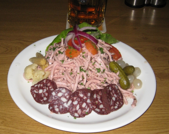 Here we are at Day 6 … and the sixth different beer. Today I had a Pilsner — “Dinkelacker CD Pils.” This is an excellent representation of the Pilsner style. The CD stands for “Carl Dinkelacker.” instead of taking another picture of me drinking, I took a picture of what I ate while drinking this pilsner … a Schwäbisches wurstsalat. If you’ve never had a big pile of sliced up with baloney combined with a few chunks of blood sausage you don’t know what you are missing! I highly recommend this wonderful meal … and the Pils.