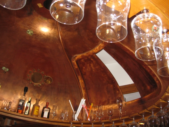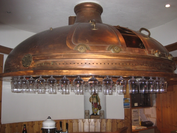 However, the restaurant “Brauerei-Gaststätte Dinkelacker Piorkowski” was open — they are right by the brewery. Normally, on Sundays they are closed … but today… yes! Open! So, I went in, sat at the bar (see pictures) and had a Maerzen Bier. I was very happy with the flavor of this beer … and it went very well with my “Wild Venison Goulash and Spaetzle.” Wow. The overhead for the bar was the top of a large mash (or lauter) tun. I took a picture of the outside and thee inside. You can see the sliding door where they could access the grain, etc.