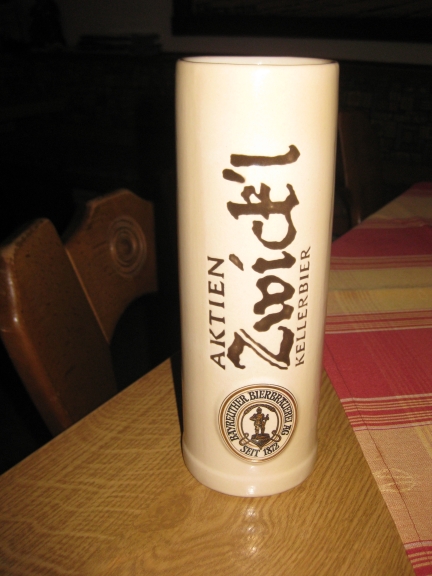 Today we went to the Naturfruenden Haus — right by the Barracks where I work (for lunch). We decided to enjoy a little refreshment (just one …) and I had a nice little unfiltered Pilsner (see a trend here?) — called Zwick’l Kellerbier from Bayreuther Bierbrauerei. I really like these Pils with the “Naturtrub” — It adds a little body to the beer that I really enjoy.