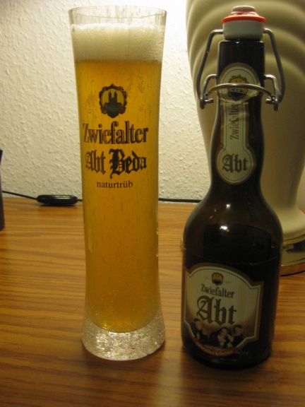 Tonight I decided to have another Zwiefalten Kloster ale — this one is their unfiltered, “cellar beer” … the Zwiefalten Abt. I really like the unfiltered beers … this one was no exception. Plus it comes in a cool flip-top bottle AND I own the exact glass with which to enjoy it! Yes!