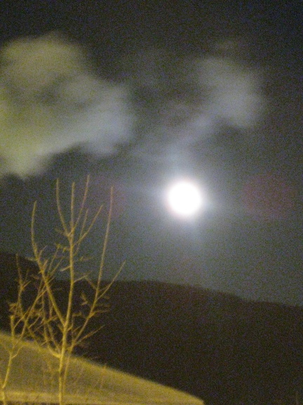 It was a full moon last night so I tried to get a couple of pictures … working with my wonderful digital camera, I managed to capture a couple of interesting shots. This first one is a picture through the window in my room — you can see the reflection of the moon on the glass — the bright circle is the actual moon, the one that looks like the moon is the reflection … cool. The other shot is from outside with the night time exposure on my camera — obviously I couldn’t get a good zoom — and it was about -12 celsius at the time so I decided not to spend anymore time outside trying to figure it out! ![]()