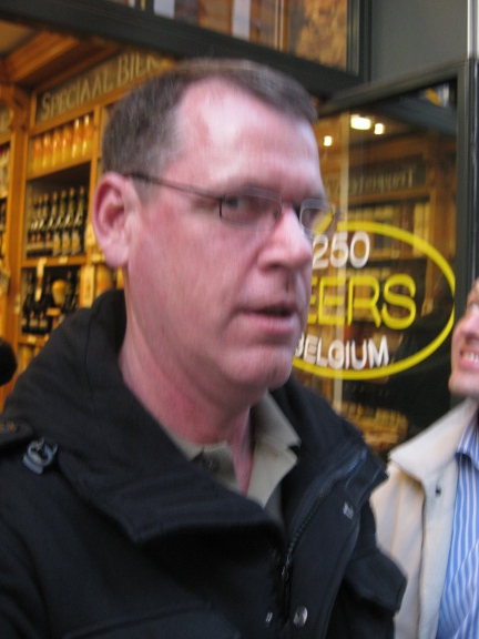 I was in Brussels for business and found myself downtown in the evening. Of course, with Brussels, everything is about the beer — maybe you can see the sign behind me here … but it says “250 beers of Belgium.” That was just the start …