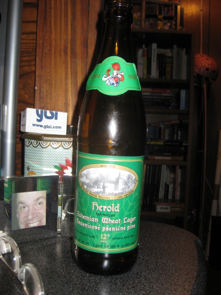 I was surprised by a friend’s refrigerator today — I opened the door to retrieve another Sam Adams Lager when I saw this green-labeled bottle behind a couple of condiments. I pulled it out and peered at it (without my reading glasses) and was able to decipher that it was a Czech Beer.