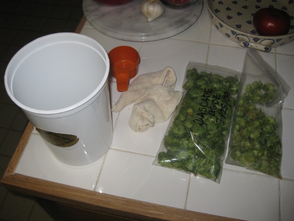 2) Here’s the next bucket being prepped for secondary. Since I’m dry hopping, I decided to use a bag to hold the hops and am using a secondary bucket instead of my normal carboy.