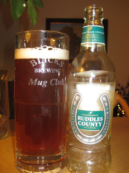 My friend Russ and his father-in-law joined me during my brew session a couple of weeks ago. To celebrate (and because Russ’ wife and in-laws are from England) they brought me a couple of bottles of this Ruddles County. Not only is Russ’ family from England, they are specifically from Bury St Edmunds, where Greene King brews all of its beers.