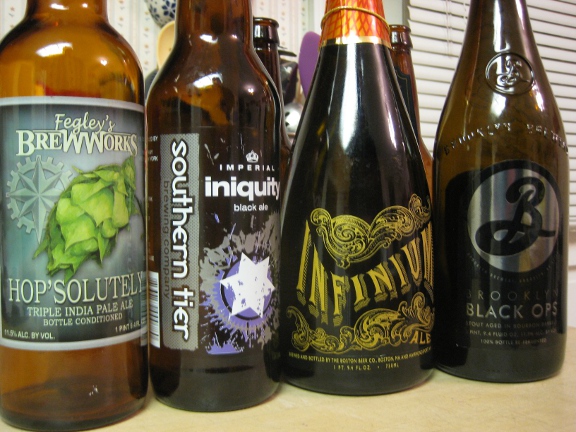 3) Brooklyn Brewery Black Ops. This beer surprised all of us. I originally thought it was another Black IPA … but upon further review, we realized it was bourbon-barrel-aged Stout. I think I should have aged it a little longer — the bourbon was really in your face with this beer … so much so that it distracted from the Stout flavor. Interesting that it was re-fermented with Champagne yeast … 2 of the 3 of us finished ours (and then had to finish the other guy’s too … he just couldn’t get past the Bourbon-flavor).
