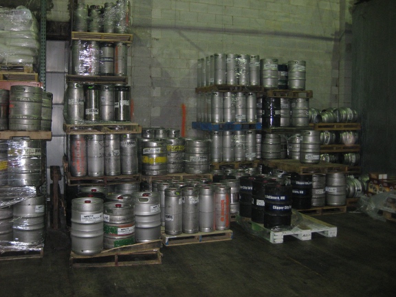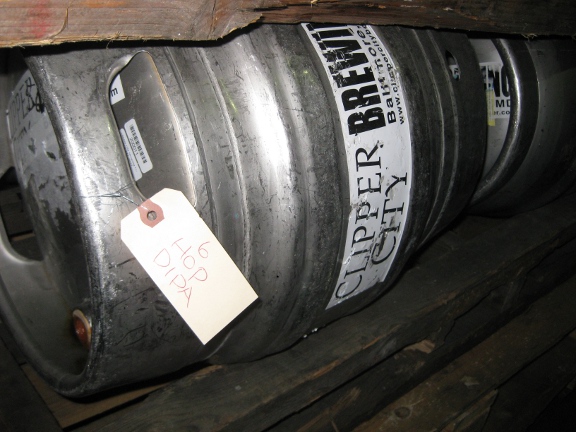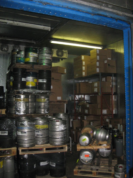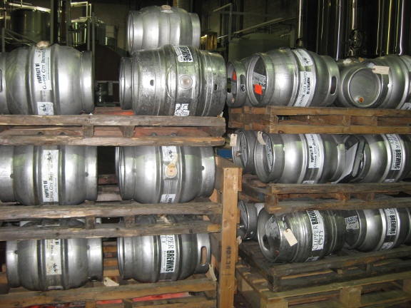 You can see my friend Brian in this last picture leaning over their Hopback. Their brewery is in one giant warehouse — so you can tell from the pictures that all their operations are crammed in there together. They just worked a deal to expand another 10,000 square feet. You can tell that all the people we interacted with really liked working there. They also do a lot of specialty brews (a lot). All the kegs in the picture below are specialty brews — the close up is a “6 Hop Double IPA.”