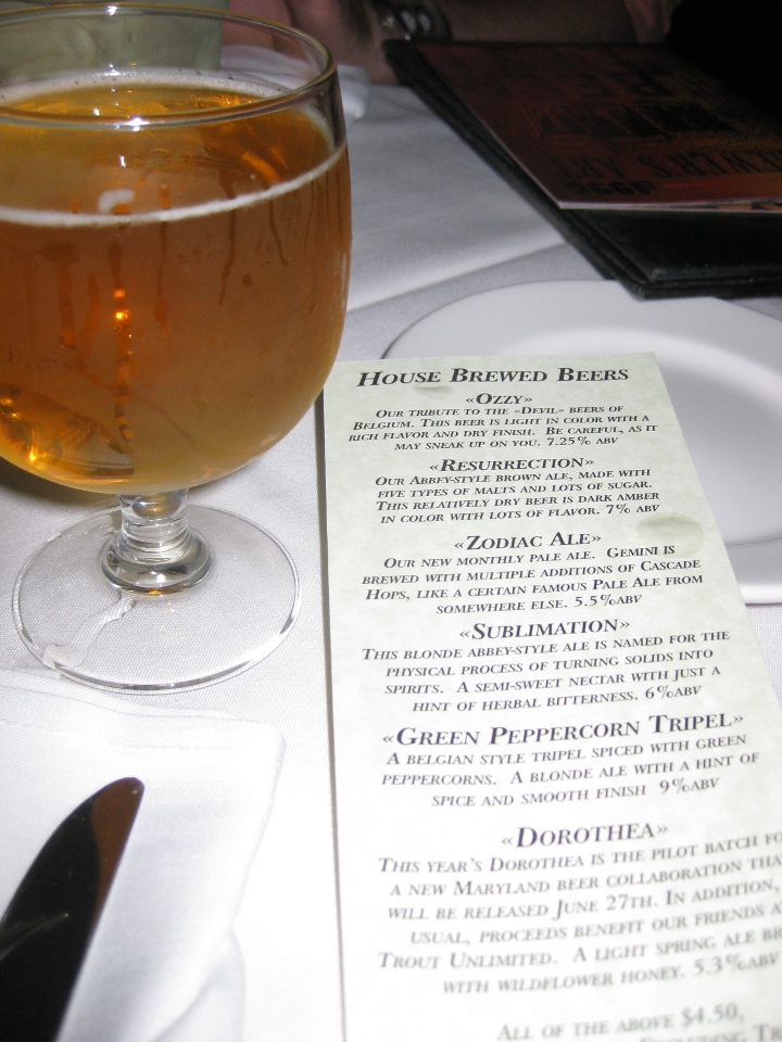 This place was pretty upscale … but then … laid back.  Quite an interesting atmosphere.  We “dined” in the upstairs portion.  The picture above with the stairs leads down to the cellar bar.  I had the Resurrection-Brined Grilled Rack of Pork.  Very tasty … however, I think I started with the wrong beer.  I went with the Green Peppercorn Tripel … wow.  This was a rock-solid Tripel–quite yummy.  I next had the Dorothea (collaboration with Stillwater (I think) … a blonde/golden ale).  Unfortunately, it was bland compared to the Tripel … I even had the Resurrection (sample)–the same.  Bland compared to the Tripel.  I should have had the Resurrection first.  I really like Dubbels … but, I really like them with the wild yeast, and I didn’t get that in this beer.