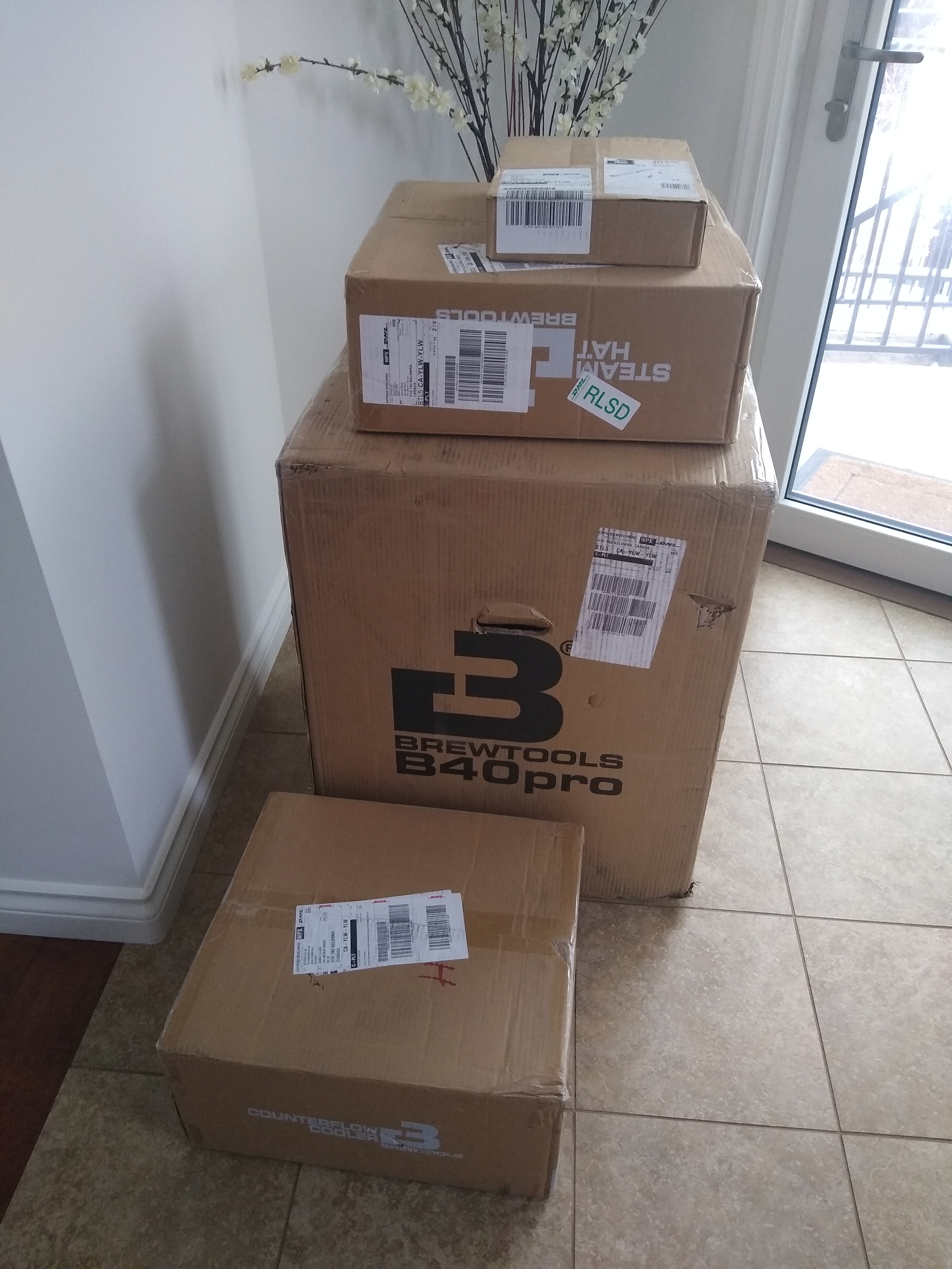 After doing some research and looking to see how my brewing process, plus my location, matched with an integrated brew system, I decided to go with the Brewtools B40 — their smallest (40L) integrated system. It looked like the right match for my location/process. Having cleared customs here in Canada it came nicely packaged to the house.