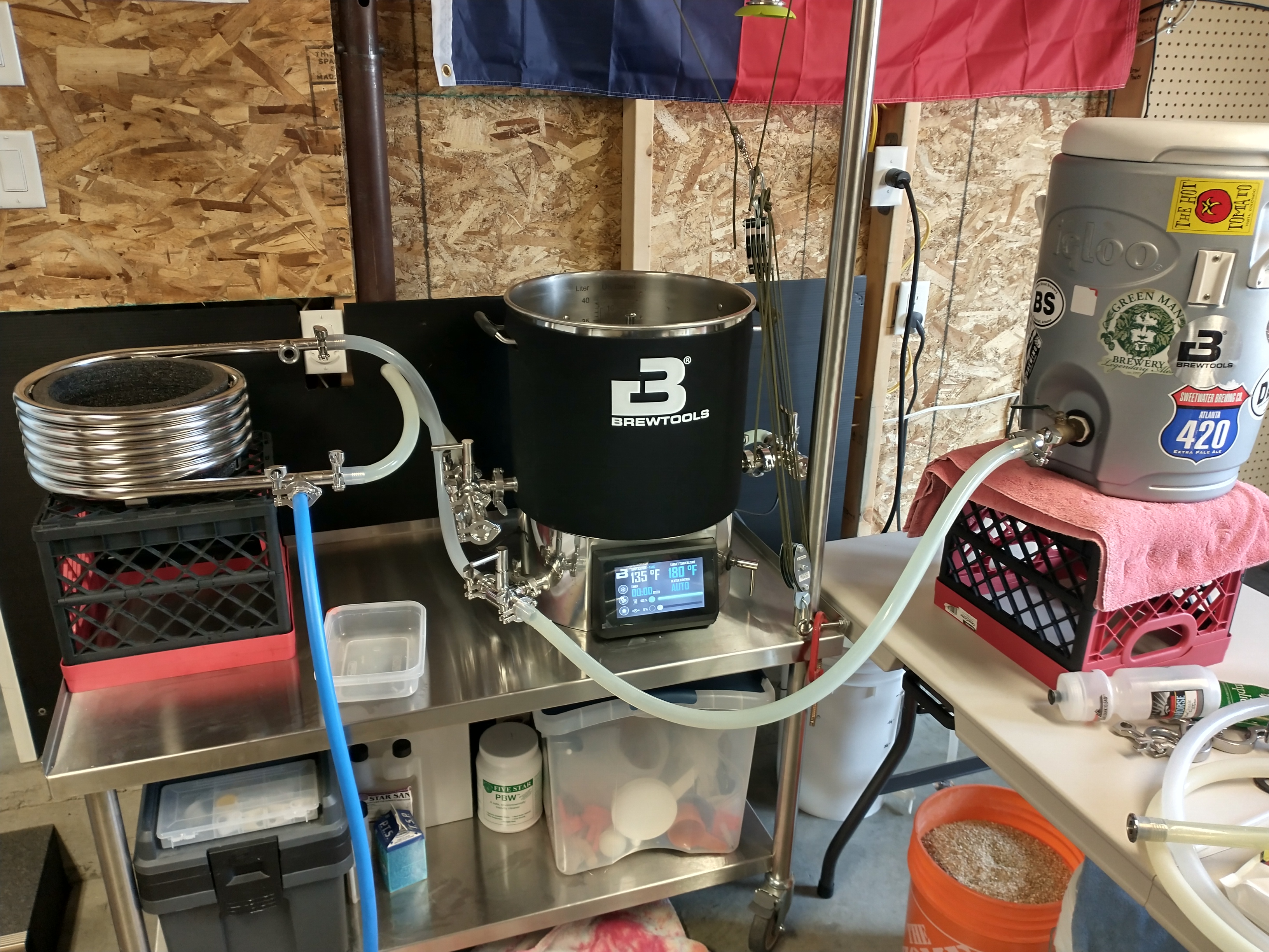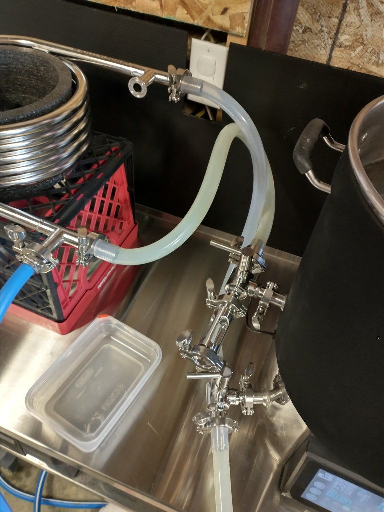 With everything in place, I was ready to test out the system! I ran through about 3 test batches (water only) to understand the best way to attach all the valves. I purchased a few extra valves, the steam hat, and the wort chiller to have a complete solution. Here’s how the system looks set up when I’m brewing a batch of beer …