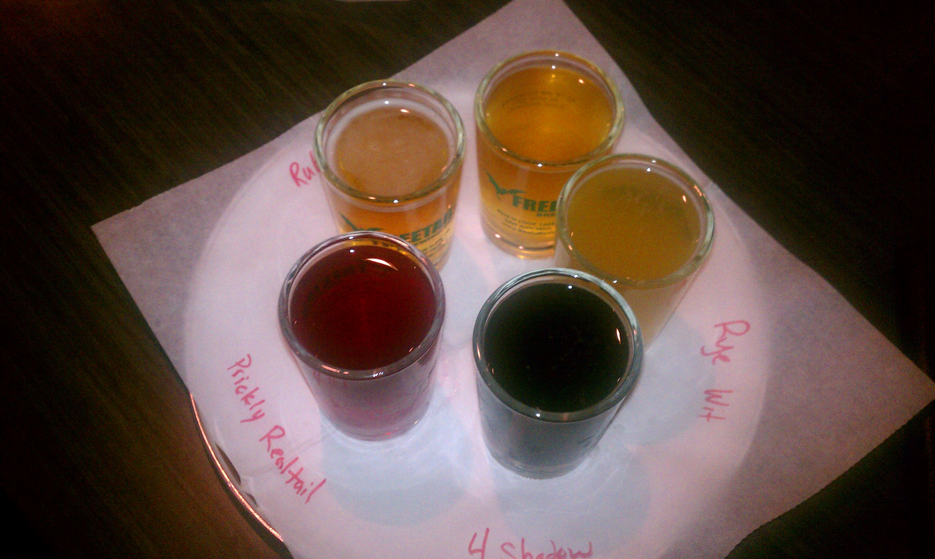 They had a great selection of local brews, so I had the sampler (with a couple of subsitutions … thanks Miko).