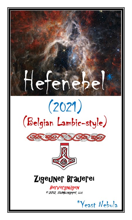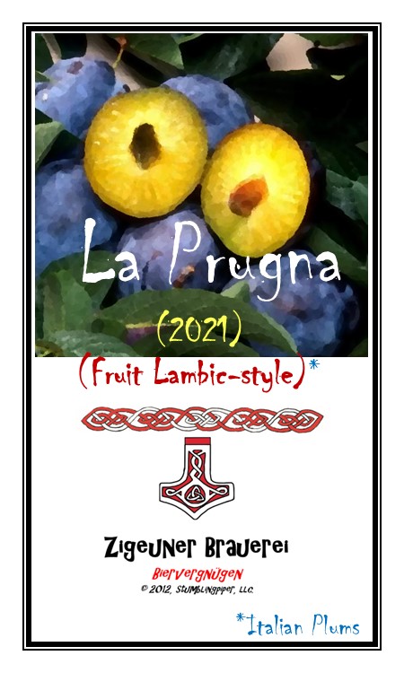 1. Belgian Lambic-style Ale (Name: Hefenebel [Translation – Yeast Galaxy]). This is a continuing experiment — I just brewed the third version of it and will be making a Gueuze out of it at the end of this year! Oh, I also make a Fruited-Lambic (Name: La Prugna) with locally-grown plums. So (a) Lambic, (b) Gueuze, and (c) Fruit Lambic.